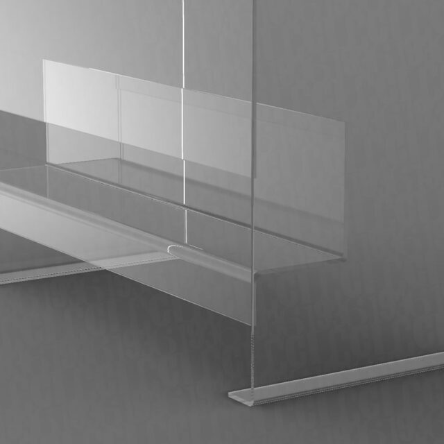 La pantalla fabricada, según requerimiento de Swiss Medical Group, brinda por la parte inferior, un estante y un calado lo cual permite la manipulacion de los producto de manera controlada y segura resguardando la salud del cliente, paciente y personal.